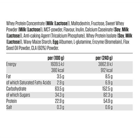 Zutaten: Molkenproteinkonzentrat (Milch (Laktose)), Maltodextrin, Fruktose, Süßmolkenpulver (Milch (Laktose)), Kakaopulver (Soja), MCT-Pulver, Aroma, Inulin, Calciumcaseinat (Soja, Milch (Laktose)), Anti - Backmittel (Tricalciumphosphat), Molkenproteinisolat (Milch (Laktose)), natürliches Aroma, Wachsmaisstärke, Eialbumin, L-Glutamin, Enzym (Bromelain), Leinsamenölpulver, CLA (60%) Pulver. Aromastoffe: Alle Aromastoffe und ihre Verwendung entsprechen der Verordnung (EU) Nr. 1334/2008.