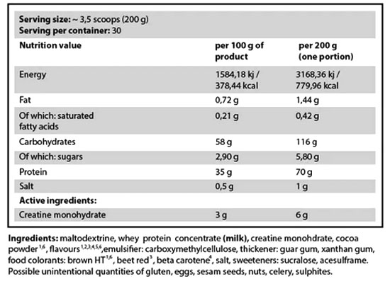 Yava Labs® Complex Mass Pro ist ein Weight Gainer Produkt und jede Portion liefert 70g Protein aus Molkenproteinkonzentrat (WPC), 116g Kohlenhydrate aus Maltodextrin und 6g Kreatinmonohydrat.